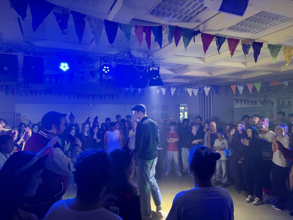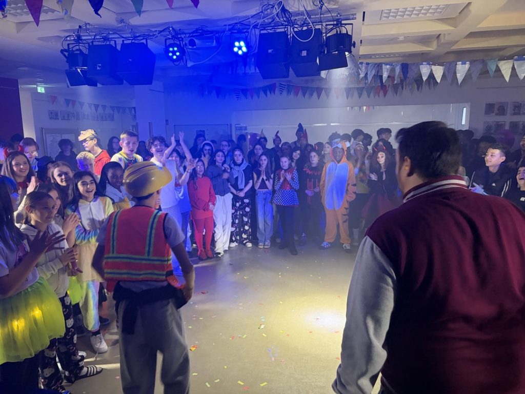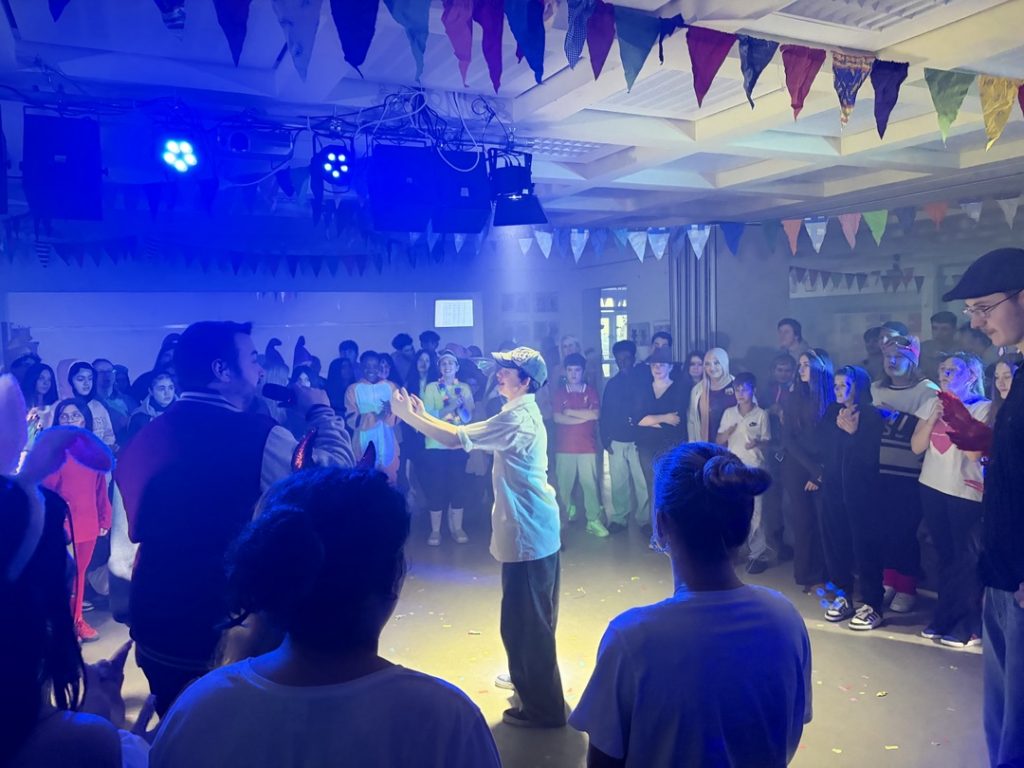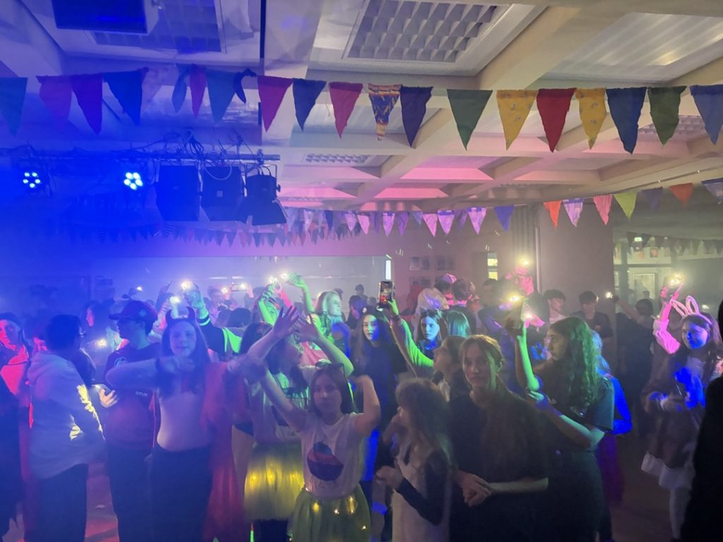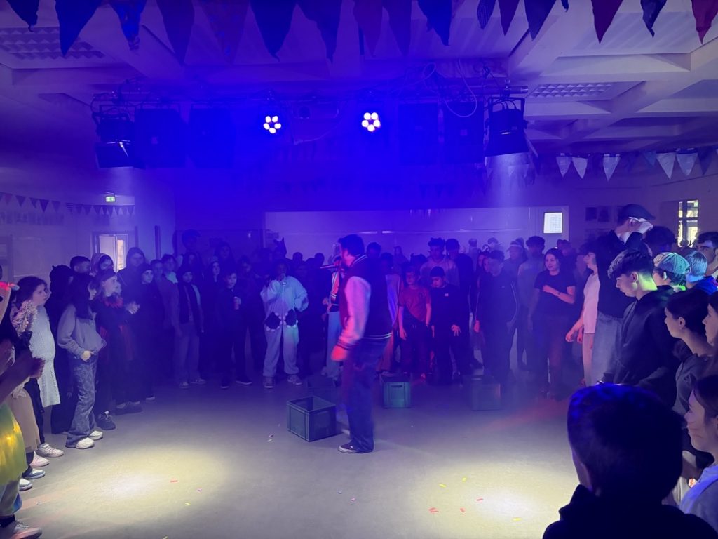 Schon vor Beginn der Feier sorgten die 10. Klassen für Stimmung: Mit einer fröhlichen Polonaise zogen sie durch das Schulhaus und holten die Schülerinnen und Schüler klassenweise ab. In der bunt geschmückten Aula wurde anschließend getanzt, gelacht und gefeiert. Für die passende Musik sorgte eine gemeinsame Playlist, die von Schülerinnen und Schülern sowie Lehrkräften zusammengestellt wurde. Ein besonderes Highlight war der Auftritt von DJ Lennox aus der 7. Klasse.